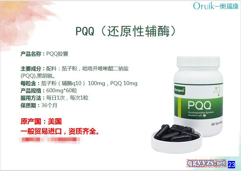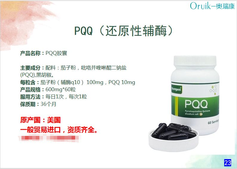 | 補(bǔ)充說(shuō)明 | 產(chǎn)品名稱:PQQ膠囊 主要成分:配料:茄子粉,吡咯并喹啉醌二鈉鹽(PQQ),黑胡椒。 每粒含:茄子粉(輔酶q10) 100mg,PQQ 10mg 產(chǎn)品規(guī)格:600mg*60粒 服用方法:每日1次,每次1粒 保質(zhì)期:36個(gè)月 原產(chǎn)國(guó):美國(guó) 一般貿(mào)易進(jìn)口,資質(zhì)齊全。 |