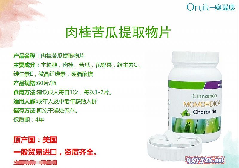 | 補(bǔ)充說明 | 產(chǎn)品名稱:肉桂苦瓜提取物片 主要成分:木糖醇,肉桂,苦瓜,花椰菜,維生素C,維生素E,微晶纖維素,硬脂酸鎂 產(chǎn)品規(guī)格:60片/瓶 食用方法:建議成人每日1次,每次1-2片。 適用人群:成年人及中老年缺鈣人群 儲(chǔ)存方法:陰涼干燥處保存。 保質(zhì)期:4年 原產(chǎn)國:美國 一般貿(mào)易進(jìn)口,資質(zhì)齊全。 |