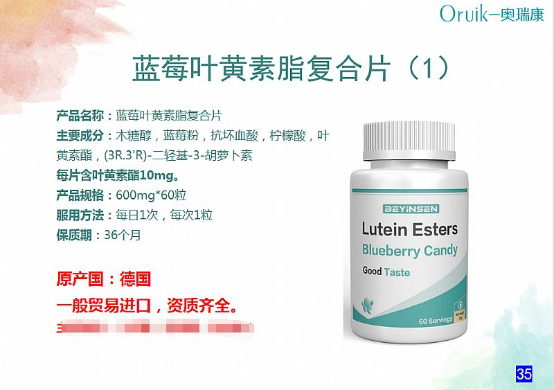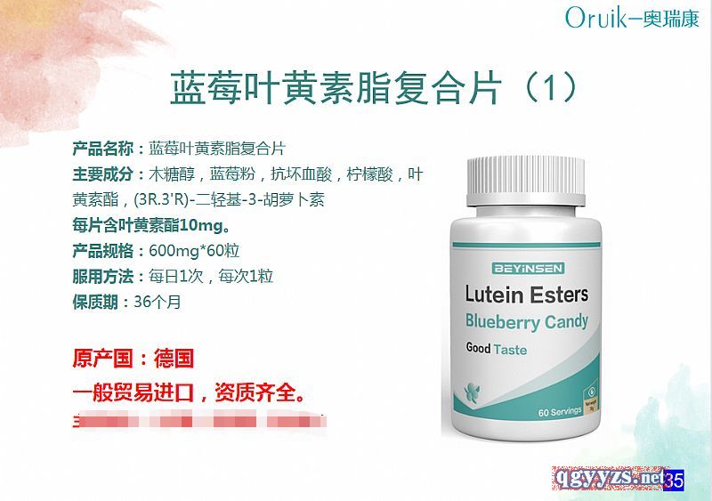 | 補(bǔ)充說明 | 產(chǎn)品名稱:藍(lán)莓葉黃素脂復(fù)合片 主要成分:木糖醇,藍(lán)莓粉,抗壞血酸,檸檬酸,葉黃素酯,(3R.3'R)-二輕基-3-胡蘿卜素 每片含葉黃素酯10mg。 產(chǎn)品規(guī)格:600mg*60粒 服用方法:每日1次,每次1粒 保質(zhì)期:36個(gè)月 原產(chǎn)國:德國 一般貿(mào)易進(jìn)口,資質(zhì)齊全。 |