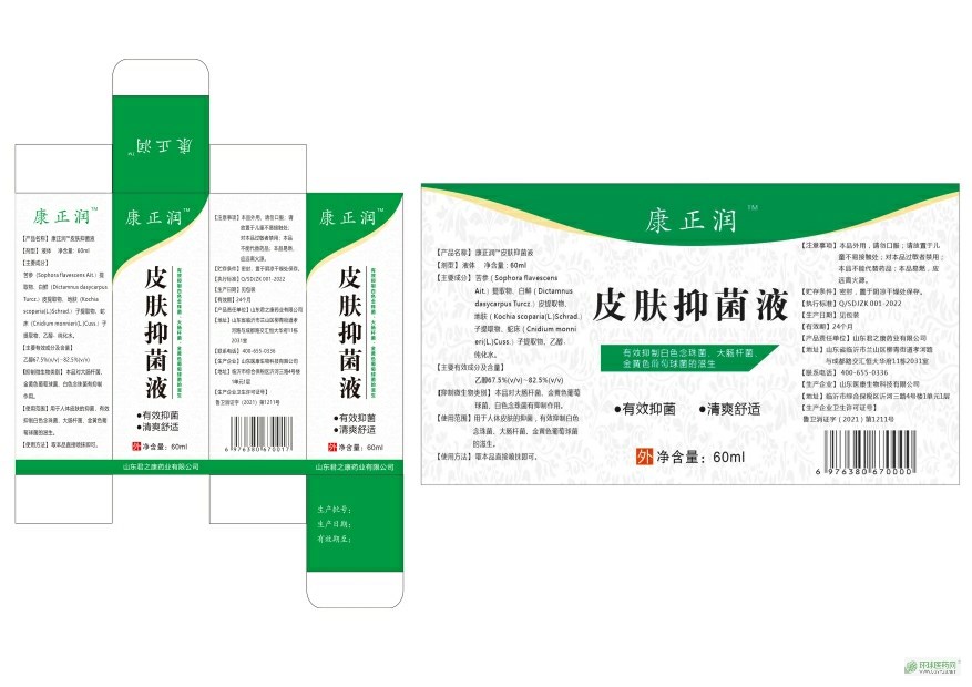 | 補(bǔ)充說(shuō)明 | 康正潤(rùn)®皮膚抑菌液產(chǎn)品說(shuō)明書(shū) 【產(chǎn)品名稱(chēng)】 康正潤(rùn)®皮膚抑菌液 【劑型】 液體 凈含量:60ml 【主要成分】 苦參(Sophora flavescens Ait.)提取物、白鮮(Dictamnus dasycarpus Turcz.)皮提取物、地膚(Kochia scoparia(L.)Schrad.)子提取物、蛇床(Cnidium m0nnieri(L.)Cuss.)子提取物、乙醇、純化水。 【主要有效成分及含量】 乙醇67.5(v/v)~82.5(v/v) 【抑制微生物類(lèi)別】 本品對(duì)大腸桿菌、金黃色葡萄球菌、白色念珠菌有抑制作用。 【使用范圍】 用于人體皮膚的抑菌,有效抑制白色念珠菌、大腸桿菌、金黃色葡萄球菌的滋生。 【使用方法】 取本品直接噴抹即可。 【注意事項(xiàng)】本品外用,請(qǐng)勿口服;請(qǐng)放置于兒童不易接觸處;對(duì)本品過(guò)敏者禁用;本品不能代替藥品;本品易燃,應(yīng)遠(yuǎn)離火源。 【貯存條件】密封,置于陰涼干燥處保存。 【執(zhí)行標(biāo)準(zhǔn)】Q/SDJZK 001-2022 【生產(chǎn)日期】見(jiàn)包裝 【有效期】24個(gè)月 【產(chǎn)品責(zé)任單位】山東君之康藥業(yè)有限公司 【地址】山東省臨沂市蘭山區(qū)柳青街道孝河路與成都路交匯恒大華府11棟2031室 【生產(chǎn)企業(yè)】山東醫(yī)康生物科技有限公司 【地址】臨沂市綜合保稅區(qū)沂河三路4號(hào)樓1單元1層 【生產(chǎn)企業(yè)衛(wèi)生許可證號(hào)】魯衛(wèi)消證字(2021)第1211號(hào) |