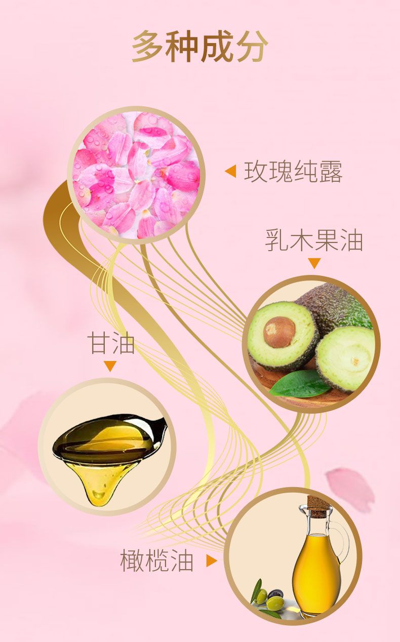 | 主要成分 | 玫瑰純露、乳木果油、馬油、甘油、橄欖油、丁二醇、角鯊?fù)、鯨蠟硬脂醇、海藻多糖、VC乙基醚、維生素E.透明質(zhì)酸鈉、純化水、醋酸氯己定。 |