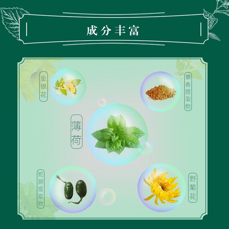 | 主要成分 | 薄荷腦、冰片、金銀花提取物、麝香提取物、野菊花提取物、蛇膽提取物、牛黃提取物、純化水、香精、醋酸氯已定等。 |