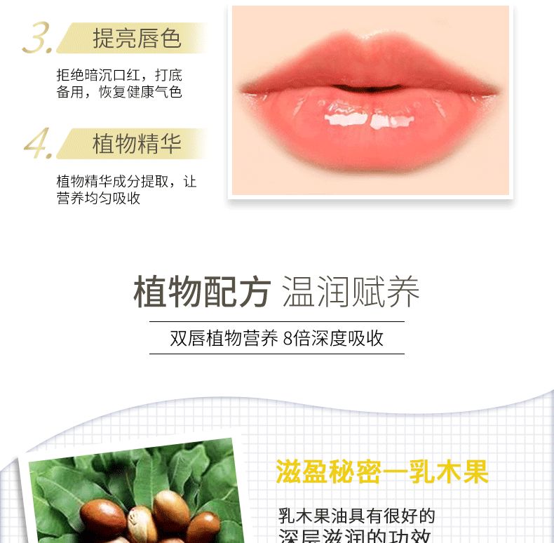 | 主要成分 | 天然山茶籽油、天然蜂蠟、橄欖油、乳木果油、凡士林、蘆薈提取物、霍霍巴脂、維生素E、薄荷腦、洋甘菊精油、胡蘿卜素、食用香精、醋酸氯已定。 |