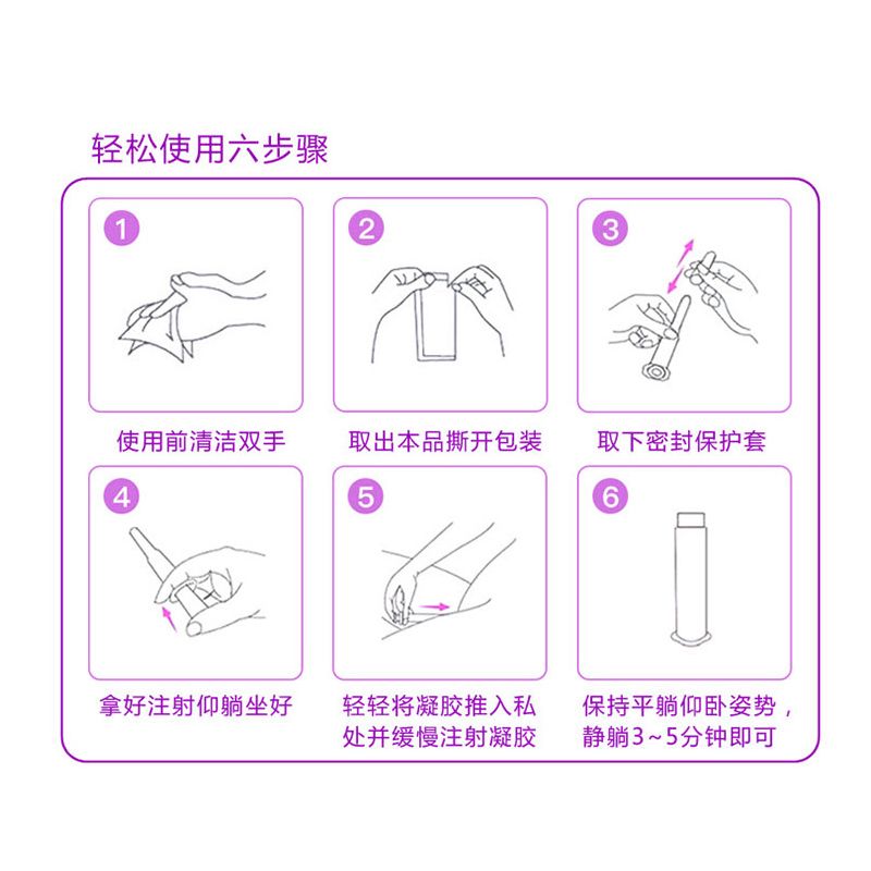 | 使用方法 | 1.自然平臥,臀部墊高,兩腿分開 2.將推射器換換插入陰道6-7cm,慢慢將凝膠-次性推入,保持2-3分鐘然后緩緩取出 3.保持不動10-15分鐘,盡避免走動,以免凝膠流出體外 |
