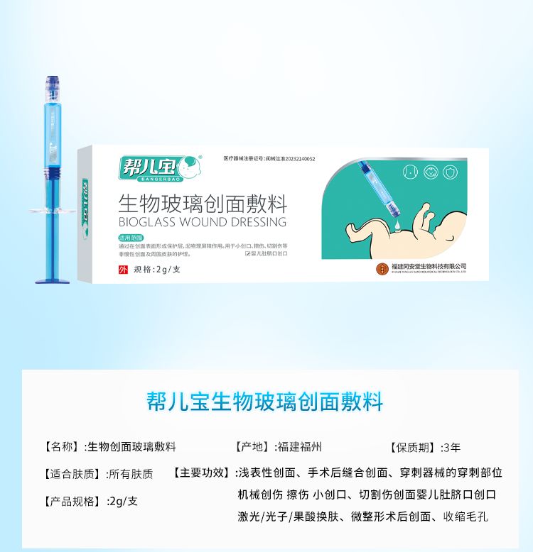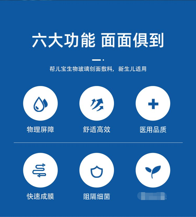 | 補充說明 | [注意事項和提示性說明] 1.一旦出現(xiàn)過敏反應,應停用本品。 2.用后一周癥狀無緩解,或出現(xiàn)局部紅腫、疼痛或其他不適癥狀時應去醫(yī)院就診。 3.請將本品放在兒童不能接觸的地方。 4.使用前請仔細閱讀說明書,請在產品有效期內使用。 5.如正在使用其他藥品,使用本品前請咨詢醫(yī)師或藥師。 6.使用后的產品按照醫(yī)院規(guī)定或環(huán)保要求處理。 7.本品適用于非慢性創(chuàng)面(如淺表性創(chuàng)面、手術后縫合創(chuàng)面、機械創(chuàng)傷、小創(chuàng)口、擦傷、切割傷創(chuàng)面、穿刺器械的穿刺部位、|度或淺I度的燒燙傷創(chuàng)面、嬰兒肚臍口創(chuàng)口、激光/光子/果酸換膚/微整形術后創(chuàng)面)的護理,為創(chuàng)面愈合提供微環(huán)境,促進創(chuàng)面愈合。 [禁忌癥]對生物玻璃過敏者禁用。 [保存條件]常溫儲存。 [生產批號]、[生產日期]詳見產品包裝標識。 [有效期]三年 |