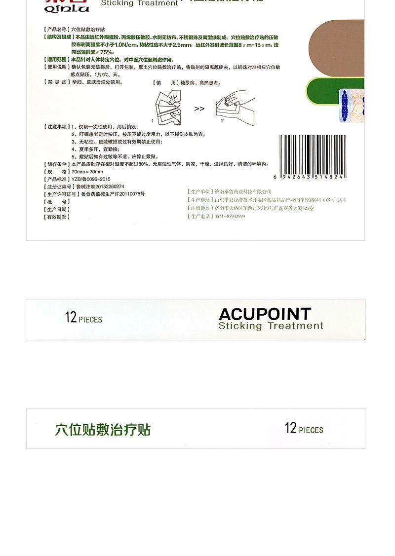 | 使用方法 | 1、清潔相應(yīng)穴位,先以拇指依次揉按相應(yīng)穴位,每穴1~2分鐘,范圍由小到大,力量由輕到重,探尋敏感點(diǎn)。2、確認(rèn)包裝無破損后,打開包裝,取出穴位貼敷治療貼,將貼劑的隔離膜撕去,以鋼珠對(duì)準(zhǔn)相應(yīng)穴位敏感點(diǎn)貼壓,1片/穴、天,每日適度按壓3~5次,每次3~5分鐘,1個(gè)療程為10天,療程間隔2~3天。 |