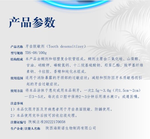 | 產(chǎn)品用途 | 本產(chǎn)品用于消除暴露的牙頸部的過敏癥狀,減輕和預(yù)防因牙本質(zhì)敏感引起的牙齒過敏癥狀。 |