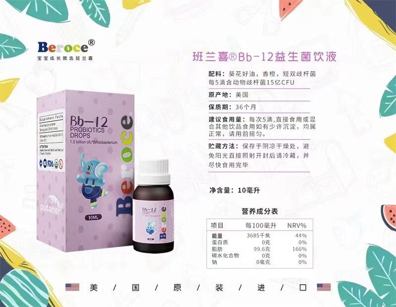 | 補充說明 | Bb-12益生菌飲液 配料:葵花籽油,香橙,動物雙岐桿菌 每5滴含動物雙岐桿菌15億CFU 建議食用量:每次5滴,直接食用或混合其他飲品食用 如有少許沉淀,均屬正常,請用前搖勻。 貯藏方法:保存于陰涼干燥處,避免陽光直接照射 開封后請冷藏,并盡快食用完畢 保質(zhì)期:36個月 原產(chǎn)國:美國 BB-12™ 動物雙歧桿菌乳亞種菌株自1985年起即作為食品原料和膳食補充劑在全球范圍內(nèi)使用,是擁有大量公開科學(xué)研究及臨床數(shù)據(jù)支持的益生菌菌株。 |