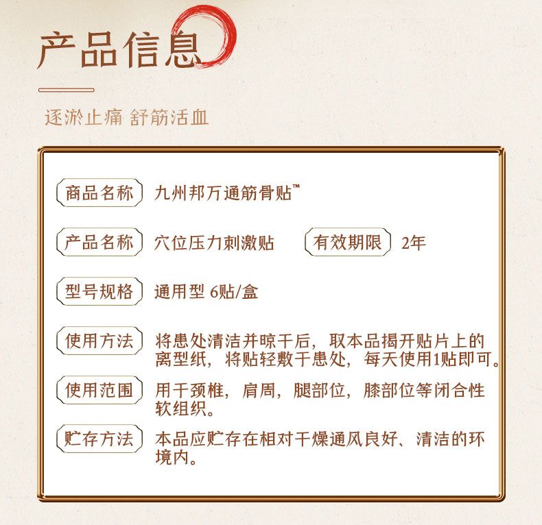 | 使用方法 | 根據(jù)中醫(yī)穴位療法,按不同癥狀(肩周炎、頸椎病、腰椎間盤突出、關(guān)節(jié)炎等)引起的疼痛部位清潔擦干后,揭掉貼片上的離型紙,貼于患處,根據(jù)貼敷部位可貼敷12-72小時(shí)。 |