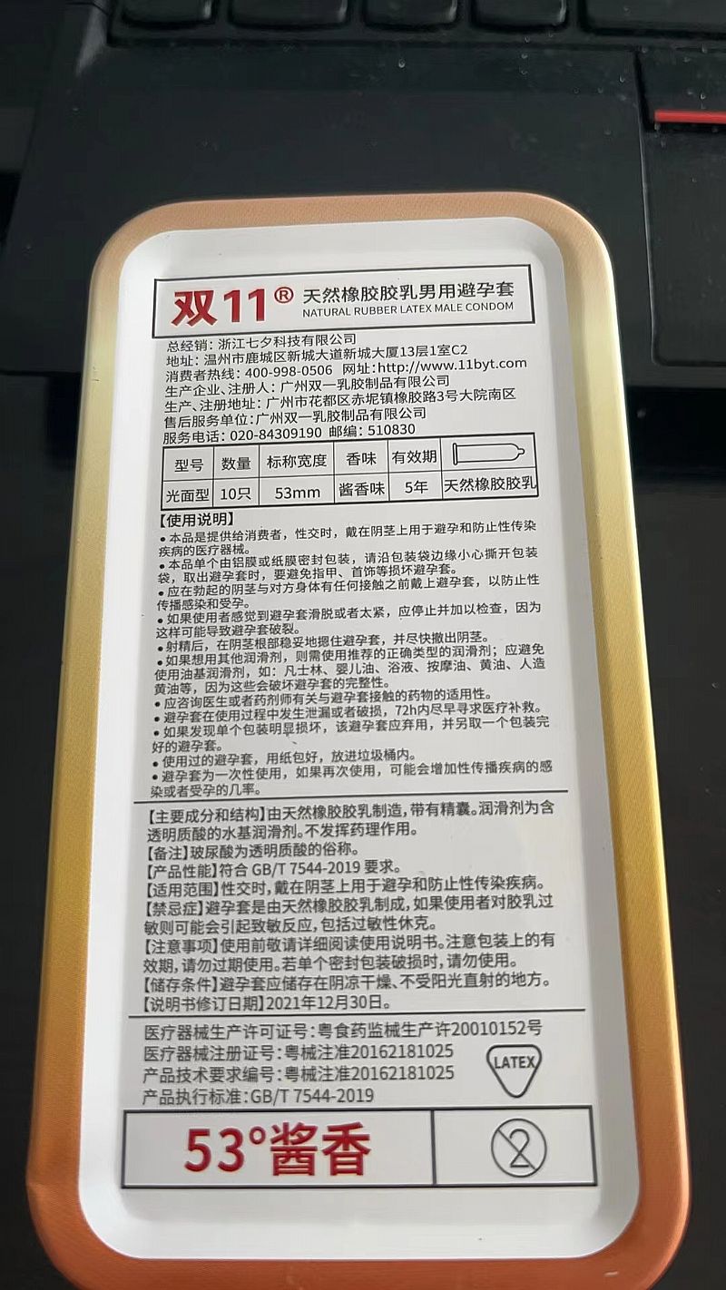 | 補(bǔ)充說明 | [禁忌癥]避孕套是由天然橡膠膠乳制成,如果使用者對(duì)膠乳過敏則可能會(huì)引起致敏反應(yīng),包括過敏性休克。 [注意事項(xiàng)]使用前敬請(qǐng)?jiān)敿?xì)閱讀使用說明書。注意包裝上的有效期,請(qǐng)勿過期使用。若單個(gè)密封包裝破損時(shí),請(qǐng)勿使用。 [儲(chǔ)存條件]避孕套應(yīng)儲(chǔ)存在陰涼干燥、不受陽光直射的地方。 醫(yī)療器械生產(chǎn)許可證號(hào):粵食藥監(jiān)械生產(chǎn)許20010152號(hào) 總經(jīng)銷:浙江七夕科技有限公司 地址:溫州市鹿城區(qū)新城大道新城大廈13層1室C2 |