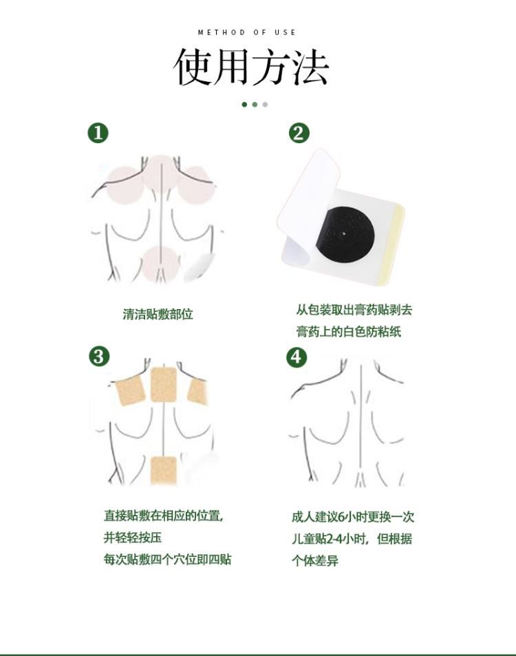 | 使用方法 | 三伏貼敷療法3~5年為一個療程。每年分為三個階段,即頭伏、中伏和末伏。一般每伏貼敷3次,每次貼4個穴位,即貼4片。兒童每次貼2~4小時,成人每次貼6小時。但根據(jù)個體差異、患者的病情,醫(yī)生會對貼敷時間、次數(shù)做適當調(diào)整。 |
