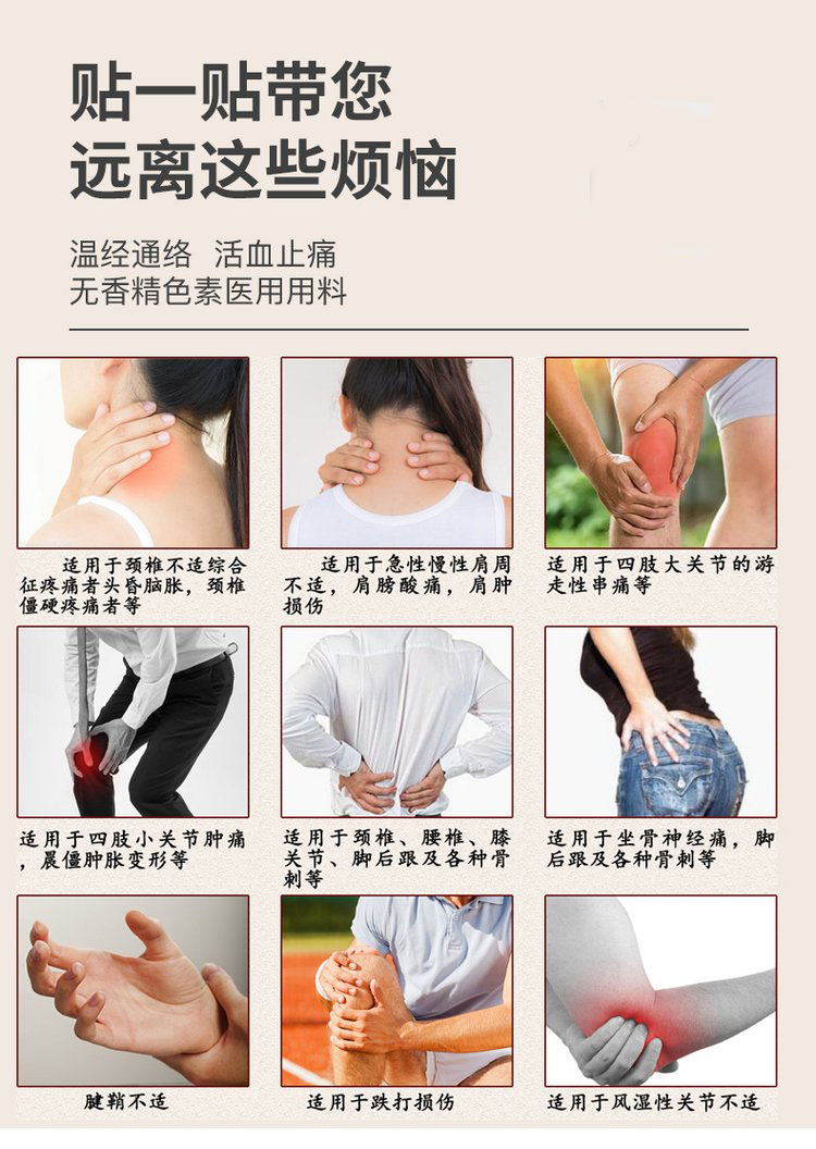| 補(bǔ)充說明 | 批發(fā)代理定制定做醫(yī)院診所OEM連鎖終端OTC中標(biāo)產(chǎn)品 是 產(chǎn)品用途 QL-I綜合適用于對頸椎病、肩周炎、骨質(zhì)增生、腰椎間盤突出、風(fēng)濕性關(guān)節(jié)炎、軟組織損傷的輔助治療。QL-A型用于頸椎病的輔助治療。QL-B型用于肩周炎的輔助治療。QL-C型用于骨質(zhì)增生的輔助治療。QL-D型用于腰椎間盤突出的輔助治療。QL-E型用于風(fēng)濕性關(guān)節(jié)炎的輔助治療。QL-F型用于軟組織損傷的輔助治療 主要成分 由遠(yuǎn)紅外陶瓷粉,丙烯酸壓敏膠和無紡布及硅油紙制成。剝離強(qiáng)度應(yīng)不低于1.0N/cm;持粘性應(yīng)不大于3mm;在8μm~15μm遠(yuǎn)紅外發(fā)射波長范圍內(nèi)的法向比輻射率不低于80%。 使用方法 清潔患處,確認(rèn)包裝無破損后,打開包裝,取出遠(yuǎn)紅外理療貼,將貼劑的隔離膜撕去,貼于患處,貼敷時間見表 |
