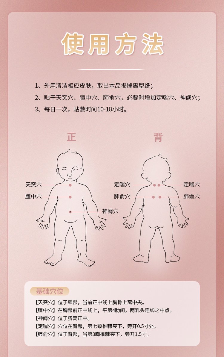 | 補(bǔ)充說明 | 中標(biāo)產(chǎn)品 是 產(chǎn)品用途 本品針對(duì)人體特定穴位,對(duì)中醫(yī)穴位起刺激作用。 主要成分 本品由遠(yuǎn)紅外陶瓷粉、丙烯酸壓敏膠、水刺無紡布、不銹鋼珠及離型紙制成。 作用機(jī)理 穴位貼敷治療貼的壓敏膠布剝離強(qiáng)度不小于1.0N/cm,持粘性應(yīng)不大于2.5mm,遠(yuǎn)紅外發(fā)射波長(zhǎng)范圍8um-15μm,法向比輻射率≥75%。 使用方法 1、清潔相應(yīng)穴位,先以拇指依次揉按相應(yīng)穴位,每穴1~2分鐘,范圍由小到大,力量由輕到重,探尋敏感點(diǎn)。2、確認(rèn)包裝無破損后,打開包裝,取出穴位貼敷治療貼,將貼劑的隔離膜撕去,以鋼珠對(duì)準(zhǔn)相應(yīng)穴位敏感點(diǎn)貼壓,1片/穴、天,每日適度按壓3~5次,每次3~5分鐘,1個(gè)療程為10天,療程間隔2~3天。 更多 小兒咳喘貼蜂蜜基質(zhì)膏貼穴位貼直供醫(yī)院藥店診所oem貼牌代加工 |