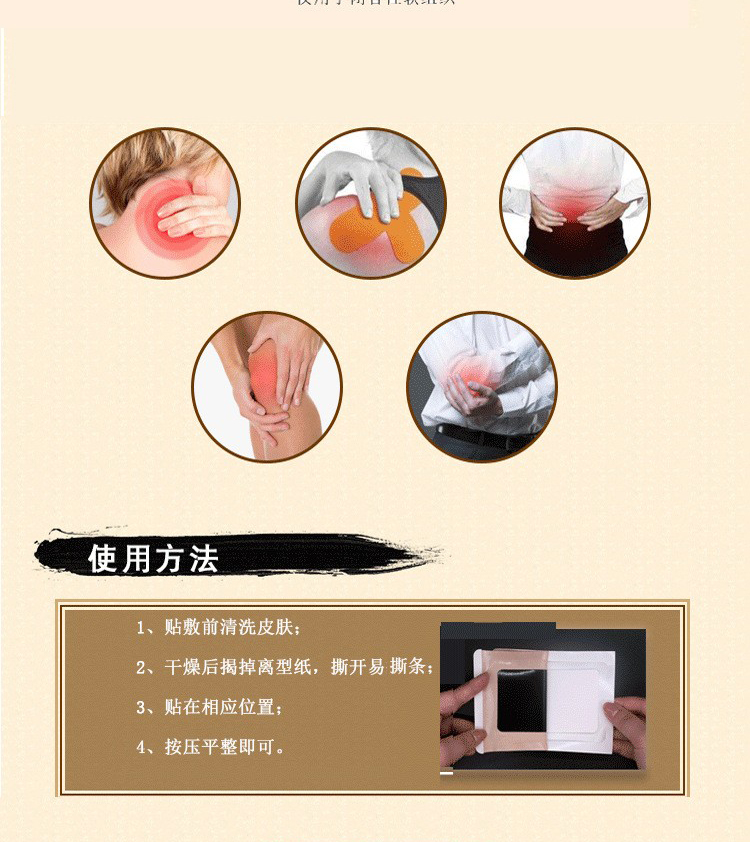 | 使用方法 | 使用方法清潔患處,確認(rèn)包裝無破損后,打開包裝,取出遠(yuǎn)紅外理療貼,將貼劑的隔離膜撕去,貼于患處,貼敷時(shí)間見表 |