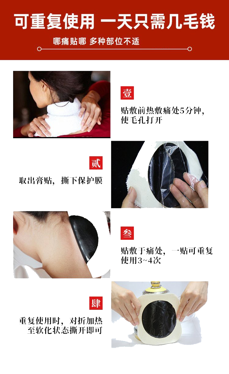 | 補(bǔ)充說(shuō)明 | 更多 手工老黑膏 頸肩腰腿貼理療貼oem貼牌代加工直供醫(yī)院藥店診所中標(biāo)產(chǎn)品 是 產(chǎn)品用途 QL-I綜合適用于對(duì)頸椎病、肩周炎、骨質(zhì)增生、腰椎間盤突出、風(fēng)濕性關(guān)節(jié)炎、軟組織損傷的輔助治療。QL-A型用于頸椎病的輔助治療。QL-B型用于肩周炎的輔助治療。QL-C型用于骨質(zhì)增生的輔助治療。QL-D型用于腰椎間盤突出的輔助治療。QL-E型用于風(fēng)濕性關(guān)節(jié)炎的輔助治療。QL-F型用于軟組織損傷的輔助治療 主要成分 由遠(yuǎn)紅外陶瓷粉,丙烯酸壓敏膠和無(wú)紡布及硅油紙制成。剝離強(qiáng)度應(yīng)不低于1.0N/cm;持粘性應(yīng)不大于3mm;在8μm~15μm遠(yuǎn)紅外發(fā)射波長(zhǎng)范圍內(nèi)的法向比輻射率不低于80%。 使用方法 清潔患處,確認(rèn)包裝無(wú)破損后,打開包裝,取出遠(yuǎn)紅外理療貼,將貼劑的隔離膜撕去,貼于患處,貼敷時(shí)間見表 |