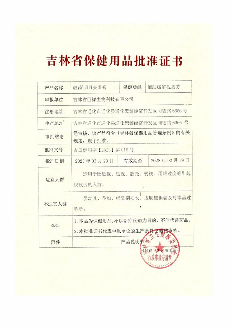 | 補(bǔ)充說明 | 產(chǎn)品:明目亮眼膏 規(guī)格:10g/瓶/盒*100盒/件 用法:適量涂抹眼周,2-3次/日。 功能:緩解視疲勞 效期:24個月 文號:吉衛(wèi)健用字[2023]第 018 號 產(chǎn)品控銷 提供學(xué)術(shù)支持 適用: 因近視、遠(yuǎn)視、散光、弱視、用眼過度等引起視疲勞的人群 配方: 谷精草、蒺藜、人參、薰衣草、檸檬草、決明子、紅花、菊花、珍珠、硼砂、薄荷、人工牛黃、薄荷腦、冰片等。 |