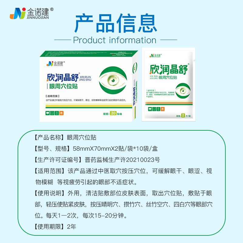 | 補充說明 | 【產(chǎn)品名稱】眼周穴位貼 【型號、規(guī)格】58mmX70mm/貼X2貼/袋X10袋/盒 【注冊證編號/產(chǎn)品技術(shù)要求編號】晉械注準20242200025 【生產(chǎn)許可證編號】晉藥監(jiān)械生產(chǎn)許20210023號 【結(jié)構(gòu)及組成】該產(chǎn)品由卡波姆、依地酸鈉、甘油、透明質(zhì)酸鈉、三乙醇胺、苯氧乙醇、薄荷油(嬌味劑)、純化水和無紡布組成。初包轉(zhuǎn)為純鋁PE級。 【產(chǎn)品性能】pH值(25℃):6.0-8.0;需氧菌數(shù)(CFU/g)≤100,霉菌和酵母菌數(shù)(CFU/g)≤100,金黃色葡萄球菌、銅綠假單胞菌,大腸埃希菌(g)不得有檢出。 【適用范圍】該產(chǎn)品通過中醫(yī)取穴按壓穴位,可緩解眼干、眼澀、視物模糊等視疲勞引起的眼部不適癥狀。 【使用說明】外用,清潔貼敷部位皮膚表面,取出穴位貼,敷貼于眼部,輕壓使貼緊皮膚,按壓晴明穴、攢竹穴、絲竹空穴、四白穴等眼部穴位。每天1一2次,每次15-20分鐘。 【禁忌癥】1.對產(chǎn)品成分過敏者禁用;(其他內(nèi)容詳見說明書) 【注意事項】1.勿貼于眼部有創(chuàng)面或者病理性皮膚、敏感性皮膚。(其他內(nèi)容詳見說明書) 【貯存/運輸條件】常溫、干燥處。 【使用期限】2年 |