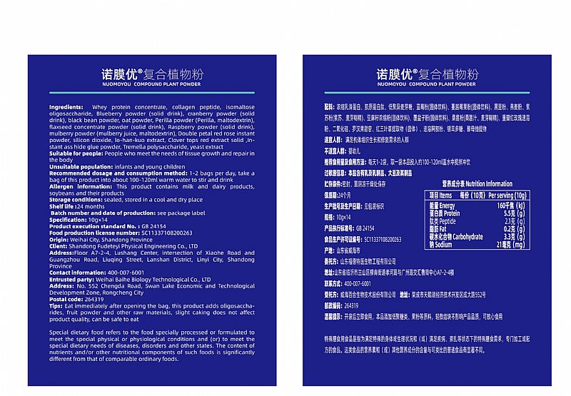 | 產(chǎn)品名稱 | 諾膜優(yōu)復(fù)合植物粉 |