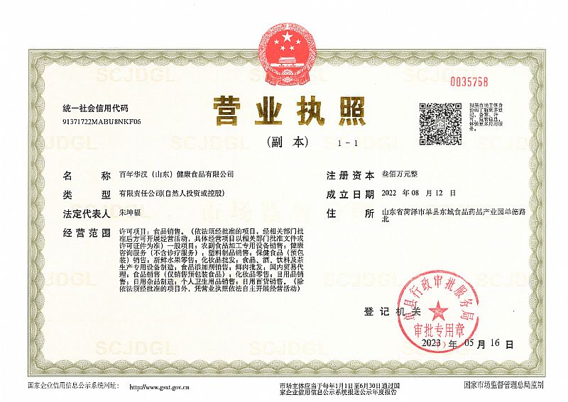生產(chǎn)企業(yè): 百年華漢(山東)健康食品有限公司