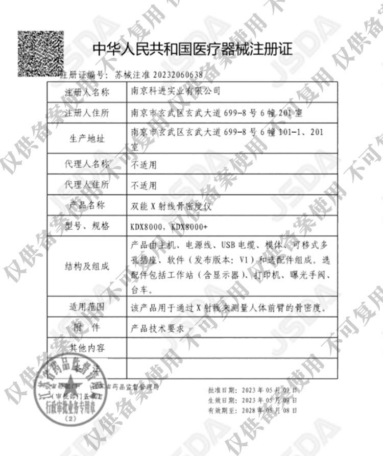 | 補(bǔ)充說(shuō)明 | 雙能X射線骨密度儀KDX8000型適用科室: 內(nèi)分泌科、體檢科、骨科、康復(fù)科、放射科、老年病科 雙能X射線骨密度儀KDX8000型功能特點(diǎn): 采用中國(guó)人數(shù)據(jù)庫(kù) 高頻小焦點(diǎn)光源技術(shù) 內(nèi)置數(shù)字高清攝像頭 高靈敏度數(shù)字探測(cè)器 自研算法,準(zhǔn)確度高 前臂定位,人工/自動(dòng)勾邊 雙能X射線骨密度儀KDX8000型產(chǎn)品優(yōu)勢(shì): 1、整機(jī)一體化設(shè)計(jì),方便移動(dòng),符合人體工學(xué),擺位方便; 2、數(shù)字化圖像采集,采用圖像增強(qiáng)算法,減少圖像清晰度損耗帶來(lái)的誤差; 3、錐形束掃描,面成像技術(shù),成像速度快,圖像灰度值均勻度好; 4、自動(dòng)/手動(dòng)識(shí)別感興趣區(qū),輔助準(zhǔn)確定位; 5、含專利定位裝置(專利號(hào):ZL 2020 2 0588523.3),增加對(duì)手臂固定的穩(wěn)定性,提高檢測(cè)值穩(wěn)定性; 6、全封閉式鉛防護(hù),達(dá)到國(guó)家職業(yè)衛(wèi)生標(biāo)準(zhǔn)要求,不需要專業(yè)屏蔽室 |