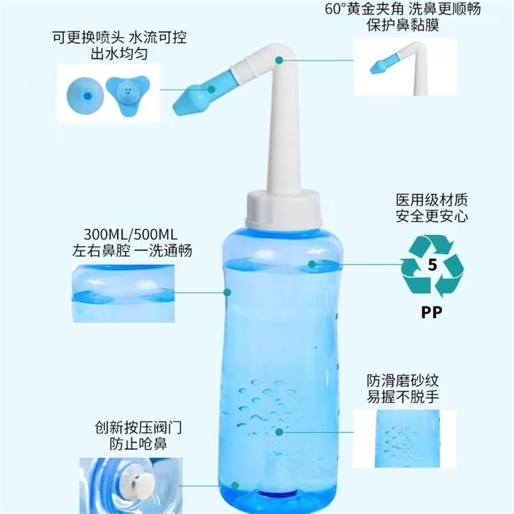 | 使用方法 | 1、在產(chǎn)品使用前應(yīng)用開水浸泡2min; 2、輕輕將沖洗頭放入鼻孔,以食指輕按沖洗頭; 3、重復(fù)以上步驟清潔另一鼻孔; 4、每次用完抹干待用。 |