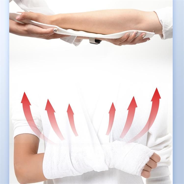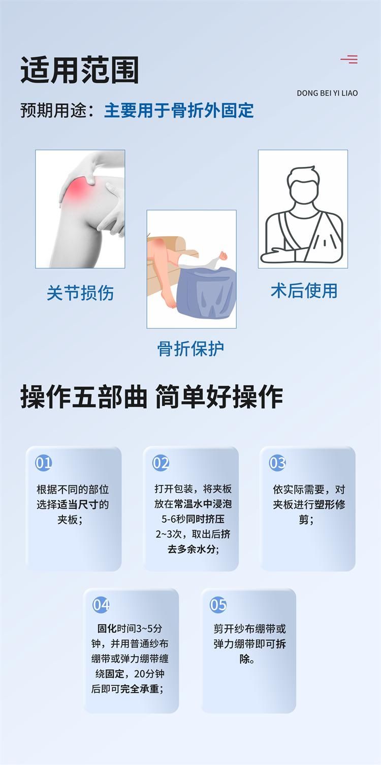 | 使用方法 | 1、根據(jù)不同的部位選擇適當(dāng)尺寸的夾板; 2、打開包裝,將夾板放在常溫水中浸泡5-6秒同時(shí)擠壓2~3次,取出后擠去多余水分; 3、依實(shí)際需要,對(duì)夾板進(jìn)行塑形修剪。固化時(shí)間3~5分鐘,并用普通紗布繃帶或彈力繃帶纏繞固定,20分鐘后即可完全承重; 4、剪開紗布繃帶或彈力繃帶即可拆除。 |