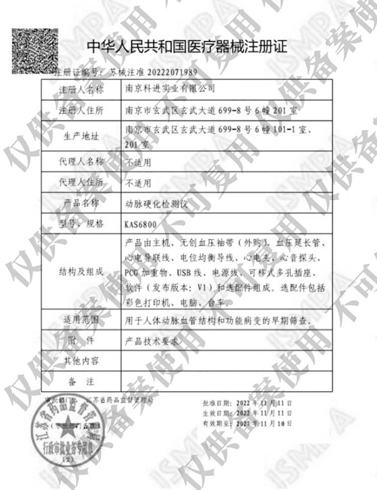 | 補(bǔ)充說(shuō)明 | 動(dòng)脈硬化檢測(cè)儀KAS6800功能特點(diǎn): 血管僵硬度檢測(cè) PWV(脈搏波傳導(dǎo)速度),評(píng)價(jià)主動(dòng)脈,大動(dòng)脈,中動(dòng)脈僵硬度指標(biāo)。 心率變異功能 通過(guò)R-R間隔均值、R-R間隔標(biāo)準(zhǔn)差、R-R間隔平均值、HR平均值、CVRR、R-R直方圖、R-R趨勢(shì)圖、心電圖判斷心血管自主神經(jīng)功能。 運(yùn)動(dòng)負(fù)荷試驗(yàn)?zāi)J?br> 確診ABI處于臨界狀態(tài)或間歇性跟行的人群是否存在下肢動(dòng)脈疾病。 上下肢動(dòng)脈阻塞程度 ABI(踝臂指數(shù)),評(píng)價(jià)下肢動(dòng)脈阻塞程度; BAI(臂踝指數(shù)),評(píng)價(jià)上肢近端動(dòng)脈阻塞程度。 動(dòng)脈硬化檢測(cè)儀適用科室: 內(nèi)分泌科、體檢中心、血管外科、高血壓科、神經(jīng)內(nèi)科、心血管內(nèi)科、功能科 動(dòng)脈硬化檢測(cè)儀輔助支臂 動(dòng)脈硬化檢測(cè)儀輔助支臂是南京科進(jìn)實(shí)業(yè)有限公司的專利設(shè)計(jì)(專利號(hào):ZL 2022 3 0045108.8),可以有效輔助操作者對(duì)受檢者進(jìn)行檢測(cè),提高檢測(cè)效率和用戶體驗(yàn)。 |