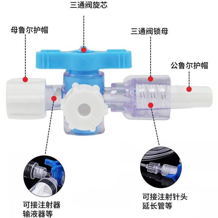 | 主要成分 | 一次性使用三通閥由公魯爾護帽、三通閥固定板、三通閥鎖母、母魯爾護帽、三通閥旋芯、三通閥底座組成。 |