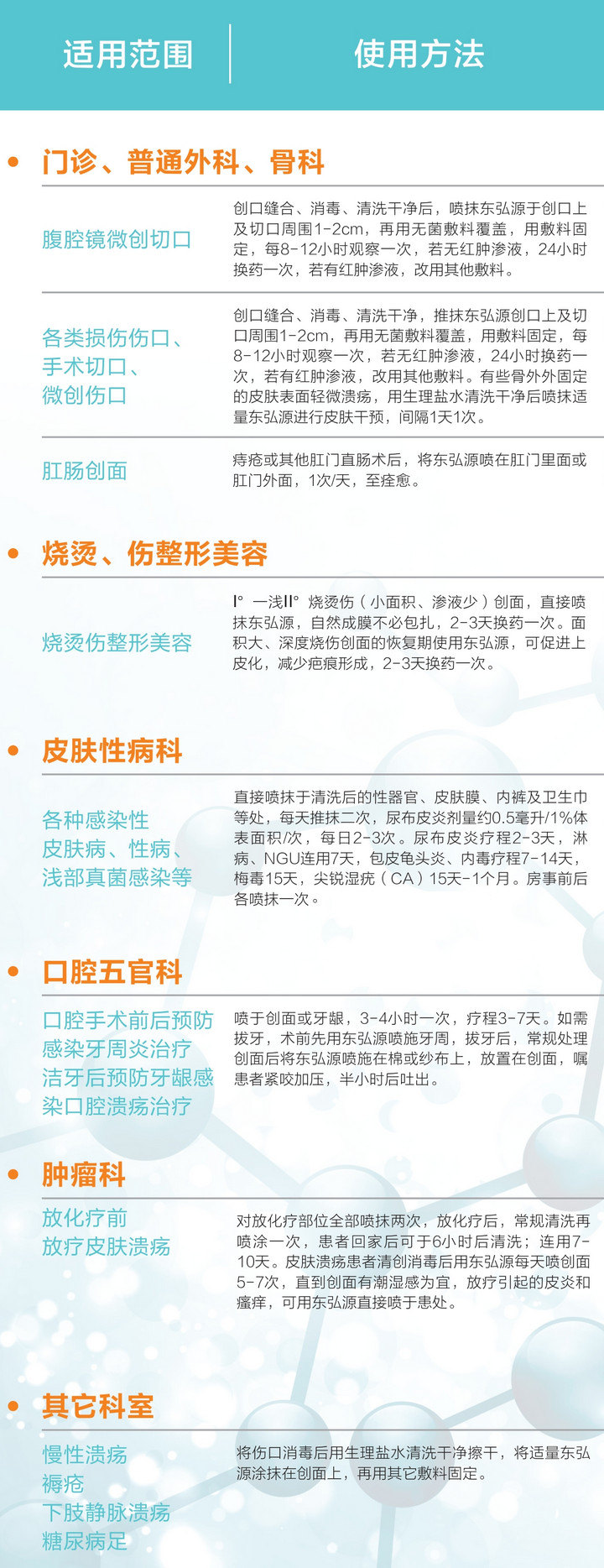 | 補(bǔ)充說明 | 東弘源醫(yī)用功能性敷料是獲得二類醫(yī)療器械注冊證的、大小切口和手術(shù)切口縫合后使用的無菌傷口液體敷噴劑,透氣、防水、保濕、、快速成膜,可提供生長修復(fù)的營養(yǎng)物質(zhì)和支架。 科室應(yīng)用: 1、婦產(chǎn)科:宮頸創(chuàng)面、宮頸活檢創(chuàng)面、宮頸糜爛手術(shù)創(chuàng)面、利普刀手術(shù)創(chuàng)面、剖腹產(chǎn)、人流及藥流前后、婦科炎癥等。 2、新生兒科、兒科:新生兒臍帶護(hù)理、嬰幼兒臂部護(hù)理等。 3、門診、普外科、骨科:腹腔鏡微創(chuàng)切口、各損傷切口、手術(shù)切口、肛腸創(chuàng)面等。 4、燒傷科、燒傷整形美容科:燒傷、燙傷創(chuàng)面。要注意燒燙臨床分期,在滲出期建議不使用本品,而在修復(fù)期、疤痕期可使用本品。 5、皮膚科、性病科:皮炎等感染性皮膚病、梅毒與尖銳濕疣等性病、淺部真菌感染等。視病情需要可同時(shí)全身應(yīng)用抗生素,東弘源二類液體傷口敷料噴劑可單獨(dú)外用,也可配合其它外用藥聯(lián)合使用。 6、口腔科、五官科:口腔手術(shù)前后預(yù)防感染,牙周炎治療,潔牙后預(yù)防牙齒牙齦感染,口腔潰瘍治療等。 7、腫瘤科:放療、化療前,放療皮膚潰瘍等。 8、內(nèi)分泌科等:慢性潰瘍、褥瘡、下肢靜脈潰瘍、糖尿病足等。 滅菌方式:作為械字號二類液體敷料,東弘源醫(yī)用功能性敷料經(jīng)高溫濕熱滅菌,已滅菌。 |