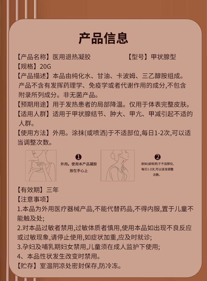 | 產(chǎn)品名稱 | 醫(yī)用退熱凝膠-甲狀腺型 |