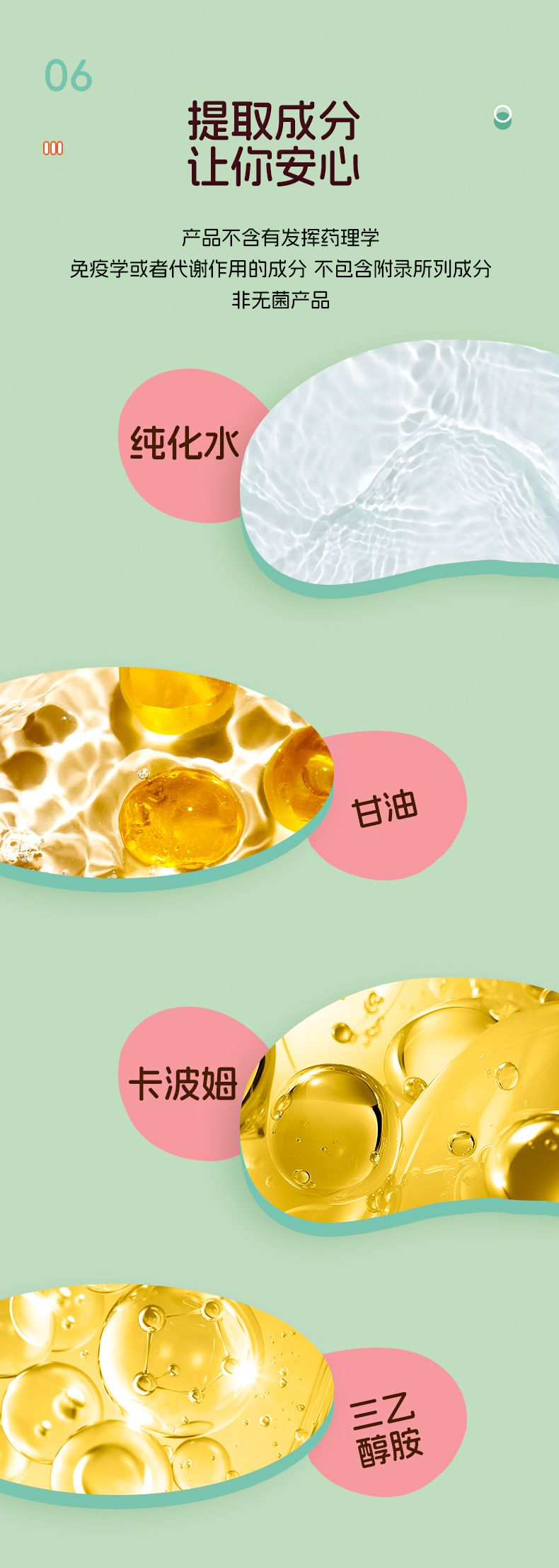 | 主要成分 | 本品由純化水、甘油、卡波姆、三乙醇胺組成。產(chǎn)品不含有發(fā)揮藥理學(xué)、免疫學(xué)或者代謝作用的成分,不包含附錄所列成分。非無菌產(chǎn)品。 |