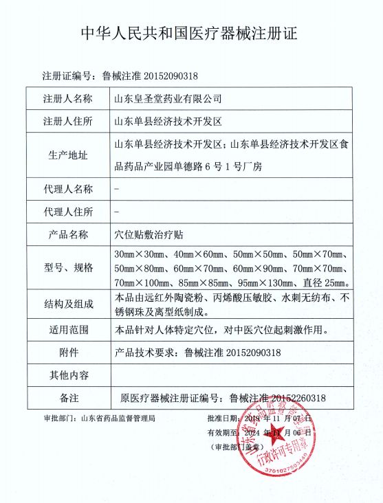 | 補充說明 | 【規(guī)格】長度:10mm~570mm;寬度:10mm~570mm 直徑:10mm~570mm 【結構及組成】本品由遠紅外陶瓷粉、丙烯酸壓敏膠、水刺無紡布、不銹鋼珠及離型紙制成。 【指標性能】穴位貼敷治療貼的壓敏膠布剝離強度不小于1.0N/cm,持粘性應不大于2.5mm,遠紅外發(fā)射波長范圍8μm-15μm,法向比輻射率≥75%。 【適用范圍】本品針對人體特定穴位,對中醫(yī)穴位起刺激作用。 【注意事項】1、僅限一次性使用,用后銷毀;2、叮囑患者定時按壓,按壓不能過度用力,以不損傷皮膚為宜;3、無粘性、包裝破損或過有效期禁止使用;4、夏季多汗,宜勤換;5、敷貼后如有過敏等不適,應停止敷貼。 【慎用】糖尿病、高熱患者。 【禁忌癥】孕婦、皮膚潰爛處禁用。 【標簽、包裝標識樣圖】保持干燥一次性使用 【使用說明】1、清潔相應穴位,先以拇指依次揉按相應穴位,每穴1~2 分鐘,范圍由小到大,力量由輕到重,探尋敏感點。2、確認包裝無破損后,打開包裝,取出穴位貼敷治療貼,將貼劑的隔離膜撕去,以鋼珠對準相應穴位敏感點貼壓,1片/穴、天,每日適度按壓3~5次,每次3~5分鐘,1個療程為10天,療程間隔2~3天。 【注冊證號】魯械注準20152090318 【產品技術要求編號】魯械注準20152090318 【生產許可證號】魯食藥監(jiān)械生產許20140114號 【注冊人】山東皇圣堂藥業(yè)有限公司 【注冊地址】山東單縣經濟技術開發(fā)區(qū) 【生產企業(yè)】山東皇圣堂藥業(yè)有限公司 【生產地址】山東單縣經濟技術開發(fā)區(qū);山東單縣經濟技術開發(fā)區(qū)食品藥品產業(yè)園單德路6號1號廠房 【聯(lián)系方式】0531-82023116 【售后服務機構】山東皇圣堂藥業(yè)有限公司 【生產日期】見單包裝 【有效期】兩年。 【儲存條件】本產品應貯存在相對濕度不超過80%,無腐蝕性氣體、干燥、通風良好、清潔的環(huán)境內。 |