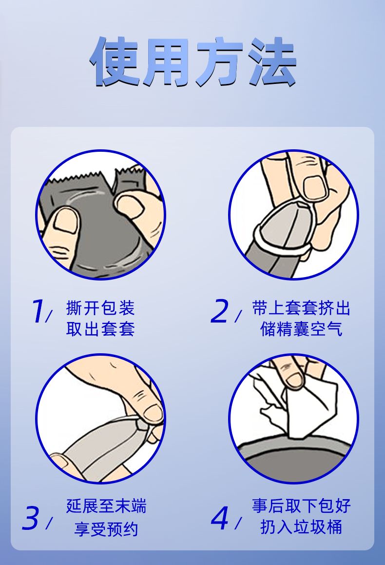 | 使用方法 | *使用本品前,請(qǐng)謹(jǐn)慎地從包裝邊部的“V”形口處撕開(kāi)包裝請(qǐng)勿使用剪刀或者其它利器。從包裝中取出時(shí)應(yīng)小心,以免被指甲、首飾等損壞避孕套。 *應(yīng)在勃起的陰莖與對(duì)方身體有任何接觸之前戴上避孕套,以防止性傳播疾病感染和受孕。 *如果感覺(jué)到避孕套滑脫或者太緊,應(yīng)停止并加以檢查以防止避孕套破裂。 *射精后,在陰莖根部穩(wěn)妥地摁住避孕套,并盡快撤出陰莖*請(qǐng)將使用后的避孕套用紙巾包好,放進(jìn)垃圾桶內(nèi)。不要棄于馬桶中,以免造成堵塞。 |