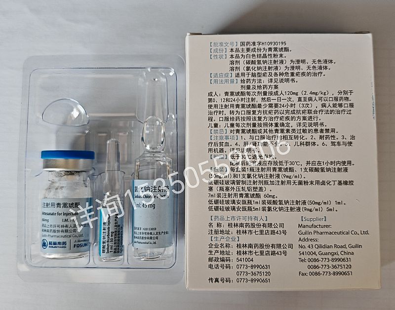 | 用法用量 | 靜脈注射。臨用前,加入所附的5%碳酸氫鈉注射液0.6ml,振搖2分鐘,待完全溶解后,加5%葡萄糖注射液或葡萄糖氯化鈉注射液5.4ml稀釋,使每1ml溶液含青蒿琥酯10mg,緩慢靜注。首次1支(或按體重1.2mg/kg),7歲以下按體重1.5mg/kg。首次劑量后4、24、48小時各重復(fù)注射1次。危重者,首次劑量可加至120mg,3日為一療程,總劑量為240~300mg。 |