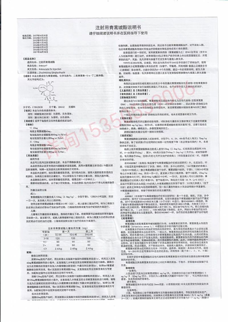 | 補(bǔ)充說明 | 【性狀】白色結(jié)晶性粉末,室溫2~3年保持穩(wěn)定。 【孕婦及哺乳期婦女用藥】孕婦慎用。 【藥理毒理】藥理學(xué):本品為青蒿素的衍生物。對瘧原蟲紅內(nèi)期有強(qiáng)大且快速的殺滅作用,能迅速控制臨床發(fā)作及癥狀。青蒿素的作用機(jī)制尚不十分清楚,主要是干擾瘧原蟲的表膜一線粒體功能。青蒿素通過影響瘧原蟲紅內(nèi)期的超微結(jié)構(gòu),使其膜系結(jié)構(gòu)發(fā)生變化。由于對食物泡膜的作用,阻斷了瘧原蟲的營養(yǎng)攝取,當(dāng)瘧原蟲損失大量胞漿和營養(yǎng)物質(zhì),而又得不到補(bǔ)充,因而很快死亡。其作用方式是通過其內(nèi)過氧化物(雙氧)橋,經(jīng)血紅蛋白分解后產(chǎn)生的游離鐵所介導(dǎo),產(chǎn)生不穩(wěn)定的有機(jī)自由基及/或其他親電子的中介物,然后與瘧原蟲的蛋白質(zhì)形成共價加合物,而使瘧原蟲死亡。毒理學(xué):動物毒理實(shí)驗(yàn)表明本品有一定的胚胎毒性,表現(xiàn)為胚胎吸收。 【藥物過量】如使用過量(大于2.75mg/kg),可能出現(xiàn)外周網(wǎng)織細(xì)胞一過性降低。 【藥代動力學(xué)】靜脈注射后血藥濃度很快下降,T1/2為30分鐘左右。體內(nèi)分布甚廣,以腸、肝、腎較高。主要在體內(nèi)代謝轉(zhuǎn)化,僅有少量由尿、糞便排泄。 【貯藏】密封,在涼暗干燥處保存。 |