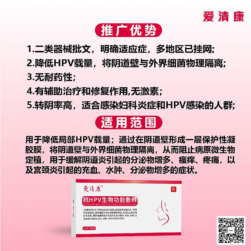 | 產(chǎn)品賣點 | 阻斷高危HPV降低載量、正規(guī)二類器械批文、明確適應癥、多地區(qū)已掛網(wǎng)、嚴格控銷。 1.二類批文,國家藥監(jiān)局批準,可刷醫(yī)保; 2.不屬于藥物,無耐藥性,成分明確,可靠性更高; 3.阻斷高危HPV降低HPV載量; 4.采用接近私處pH值的標準,無激素; 5.屬于功效型產(chǎn)品,有輔助治療和修復作用; 6.適合反復感染婦科炎癥和HPV感染的高危人群;控銷;控銷; |