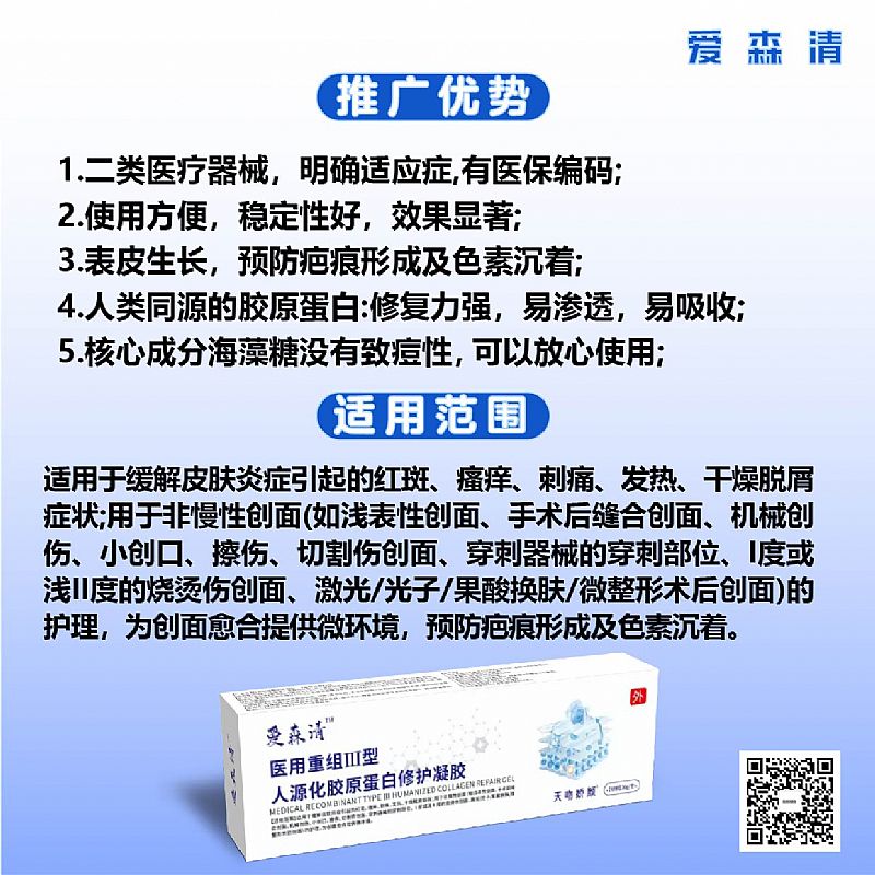 | 產(chǎn)品賣點(diǎn) | 皮膚修復(fù)消炎、表皮生長傷口護(hù)理、正規(guī)二類器械批文、一區(qū)一碼,嚴(yán)格控銷,臨床驗(yàn)證,市場高度認(rèn)可。 1.二類批文,國家藥監(jiān)局批準(zhǔn),可刷醫(yī)保; 2.屬于功效型產(chǎn)品,有輔助治療和修復(fù)作用,預(yù)防疤痕形成及色素沉著; 3使用方便,穩(wěn)定性好,效果**; 4核心成分海藻糖沒有致痘性,比較安心,可以放心使用,對(duì)于孕婦可用; 5配方選用人類同源的膠原蛋白:修復(fù)力強(qiáng),易滲透,易吸收;控銷; |