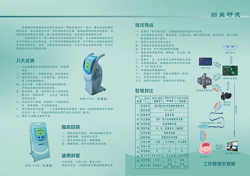 采用半導(dǎo)體制冷(帕爾貼效應(yīng))技術(shù),通過(guò)循環(huán)系統(tǒng)將用戶(hù)設(shè)置溫度冷凍介質(zhì)注入冷敷頭帶,并形成循環(huán)回路(帶有體溫檢測(cè))以控制腦溫、保護(hù)腦細(xì)胞。
