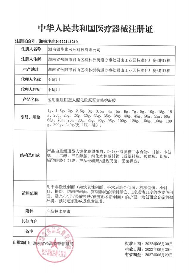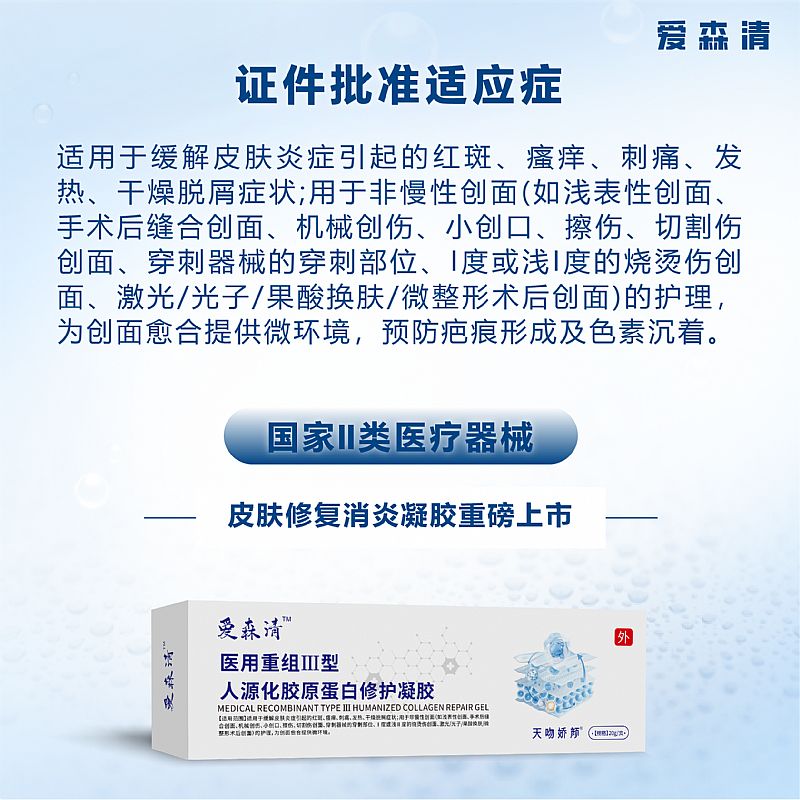 | 產(chǎn)品名稱 | 醫(yī)用重組Ⅲ型人源化膠原蛋白修護凝膠 |