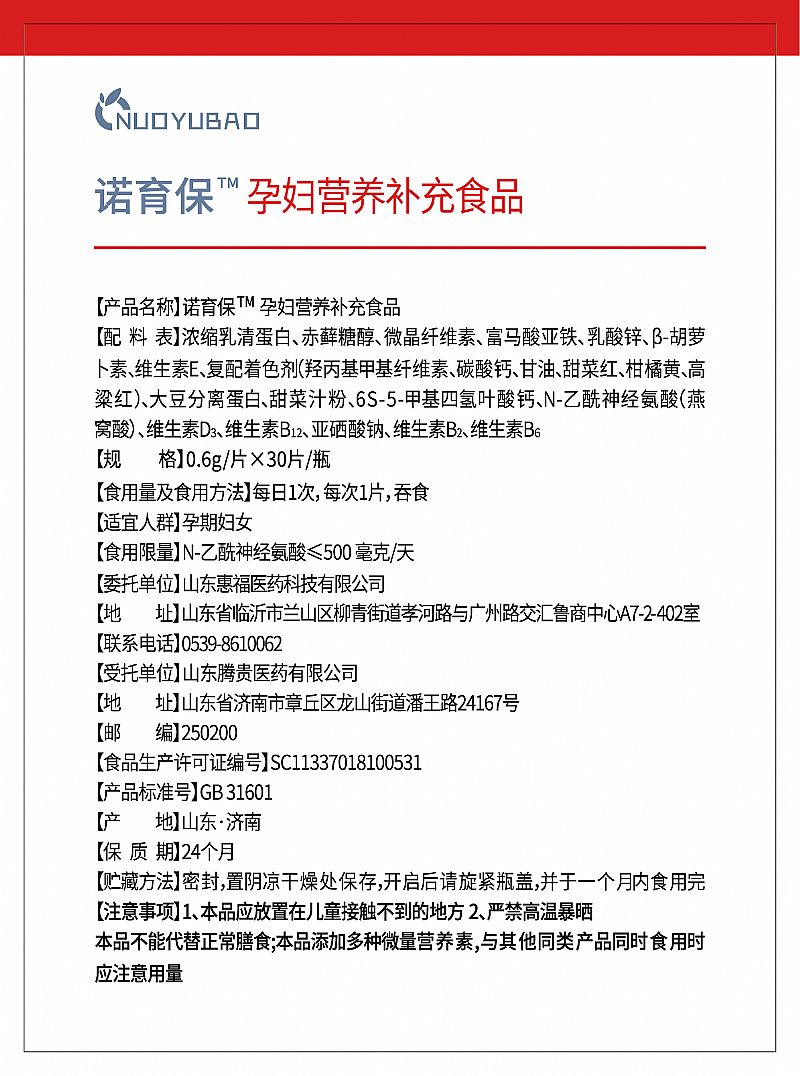 | 補(bǔ)充說明 | [適宜人群]孕期婦女 [產(chǎn)地]山東.濟(jì)南 保質(zhì)期]24個(gè)月 [貯藏方法]密封,置陰涼干燥處保存;開啟后請(qǐng)旋緊瓶蓋并于-個(gè)月內(nèi)食用完。 [注意事項(xiàng)] 本品應(yīng)放置在兒童接觸不到的地方。 |