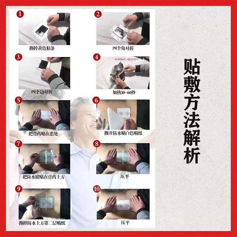| 使用方法 | 清潔皮膚:使用前,先清潔貼敷部位的皮膚,確保皮膚干燥、無油脂、污垢和傷口?梢杂脺厮潦酶蓛,待皮膚自然晾干。 找準穴位或疼痛部位:根據(jù)自身的癥狀和需要,確定要貼敷的穴位或疼痛明顯的部位。 揭開保護膜:輕輕揭開膏藥的保護膜,注意不要弄臟粘性面。 貼敷膏藥:將膏藥平整地貼在選定的部位,用手指輕輕按壓,使其與皮膚充分接觸,確保貼得牢固。 保持時間:根據(jù)產(chǎn)品說明,一般建議貼敷一定的時間,如8-24小時。 取下膏藥:貼敷時間結(jié)束后,輕輕揭下膏藥。如果粘貼較緊,可以用溫水浸濕邊緣,使其更容易取下。 |