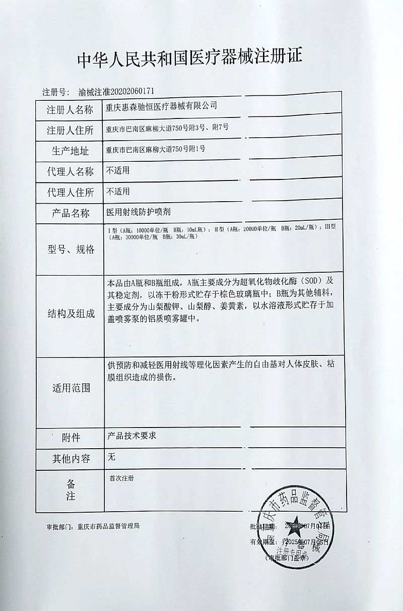 | 補(bǔ)充說明 | 【產(chǎn)品名稱】醫(yī)用射線防護(hù)噴劑 【型號(hào)規(guī)格】Ⅰ型 (A瓶:10000單位/瓶 B瓶:10mL/瓶);Ⅱ型 (A瓶:20000單位/瓶 B瓶:20mL/瓶);Ⅲ型 (A瓶:30000單位/瓶 B瓶:30mL/瓶); 【結(jié)構(gòu)組成】本品由A瓶和B瓶組成,A瓶主要成分為超氧化物歧化酶(SOD)及其穩(wěn)定劑,以凍干粉形式貯存于棕色玻璃瓶中;B瓶為其他輔料,主要成分為山梨酸鉀、山梨醇、姜黃素,以水溶液形式貯存于加蓋噴霧泵的鋁質(zhì)噴霧罐中。 【主要性能】 1、醫(yī)用射線防護(hù)噴劑的pH值為6.0~8.0。 2、醫(yī)用射線防護(hù)噴劑的SOD活力不得低于1000單位/mL。 3、需氧菌總數(shù):每1mL不得超過200cfu;霉菌和酵母菌總數(shù):每1mL不得超過20cfu;不得檢出金黃色葡萄球菌、銅綠假單胞菌。 【適用范圍】供預(yù)防和減輕醫(yī)用射線等理化因素產(chǎn)生的自由基對(duì)人體皮膚、粘膜組織造成的損傷。 【使用說明】 1、使用時(shí)先沿箭頭方向?qū)⑽髁制科可w撕開,將瓶?jī)?nèi)的SOD凍干粉末**裝入鋁質(zhì)噴霧罐內(nèi)(對(duì)于西林瓶?jī)?nèi)壁少量殘留SOD粉末,可將鋁質(zhì)噴霧罐內(nèi)適量原液倒入西林瓶?jī)?nèi),潤濕內(nèi)壁,將內(nèi)壁殘留SOD粉末溶解完后轉(zhuǎn)入鋁質(zhì)噴霧罐內(nèi)),再將噴霧頭旋緊后充分振搖使之溶解,即可。 2、拔下罩蓋,對(duì)準(zhǔn)放療照射野內(nèi)皮膚粘膜組織,以及放療損傷的皮膚粘膜組織,均勻噴射,放療前后使用。每平方厘米噴2-4次(約0.2mL),每日3-5次,放療結(jié)束后,繼續(xù)噴用7-10天,或遵醫(yī)囑。 【禁忌癥與注意事項(xiàng)】 1、按壓噴霧泵不得用力過猛,以防噴霧泵損壞,每次噴用完畢后,蓋緊罩蓋,放至陰涼、遮光、干燥處; 2、本產(chǎn)品適用于成人;過敏體質(zhì)者慎用,如發(fā)現(xiàn)使用本品后出現(xiàn)皮膚粘膜組織不適反應(yīng),應(yīng)停止使用; 3、本品禁止內(nèi)服; 4、不慎噴入口、鼻、眼內(nèi),用清水沖洗即可; 5、噴霧瓶、噴霧泵破損或噴液渾濁不得使用; 6、本品一旦啟用,一個(gè)月內(nèi)用畢為宜。 7、用完扔垃圾桶,按醫(yī)療廢品**處置。 【生產(chǎn)日期】見包裝 【生產(chǎn)批號(hào)】見包裝 【有 效 期】2年 【貯 藏】陰涼、遮光、干燥處存放。 【注冊(cè)證/產(chǎn)品技術(shù)要求編號(hào)】 【醫(yī)療器械生產(chǎn)企業(yè)許可證編號(hào)】 【注冊(cè)人】重慶惠森馳恒醫(yī)療器械有限公司 【注冊(cè)人住所】重慶市巴南區(qū)麻柳大道750號(hào)附3號(hào)、附7號(hào) 【生產(chǎn)企業(yè)】重慶惠森馳恒醫(yī)療器械有限公司 【生產(chǎn)地址】重慶市巴南區(qū)麻柳大道750號(hào)附1號(hào) 【售后服務(wù)單位】重慶惠森馳恒醫(yī)療器械有限公司 【郵政編碼】4013320 【編制日期】 |