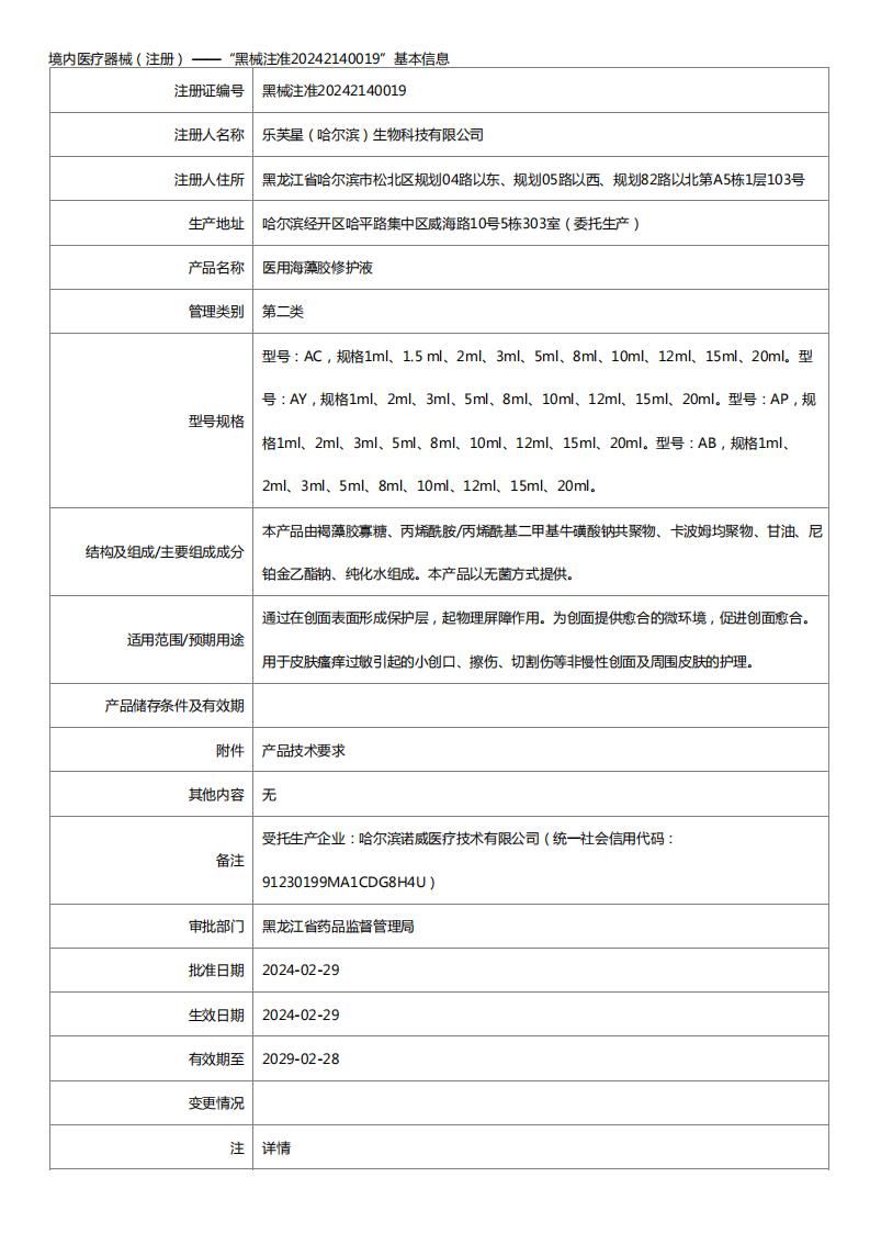 | 補充說明 | 【產(chǎn)品名稱】醫(yī)用海藻膠修護液 【型號規(guī)格】型號:1.5ml*10支/盒 【生產(chǎn)許可證編號】黑藥監(jiān)械生產(chǎn)許20220006號 【醫(yī)療器械注冊證編號】黑械注準20242140019 【產(chǎn)品技術要求編號】黑械注準20242140019 【產(chǎn)品性能】本產(chǎn)品為淡黃色至黃褐色液體。潔凈,無污染。本品經(jīng)Co60輻照滅菌后應無菌。 【結構及組成】本產(chǎn)品由褐藻膠寡糖(褐藻酸寡糖)、丙烯酰胺/丙烯酰基二甲基;撬徕c共聚物、卡波姆均聚物、甘油、尼鉑金乙酯鈉、純化水組成。 【適用范圍】通過在創(chuàng)面表面形成保護層,起物理屏障作用。為創(chuàng)面提供愈合的微環(huán)境,促進創(chuàng)面愈合。用于皮膚瘙癢過敏引起的小創(chuàng)口、擦傷、切割傷等非慢性創(chuàng)面及周圍皮膚的護理。 【使用方法】局部外用,每天使用三次,15天為一個療程。 【禁忌癥】目前尚未發(fā)現(xiàn)不良事件與禁忌,使用中應注意個體差異。 【儲存條件】陰涼處保存。 【滅菌方式】無菌產(chǎn)品經(jīng)Co60輻照滅菌。 【生產(chǎn)日期】、【使用期限】見標簽 【有效期限】2年 |