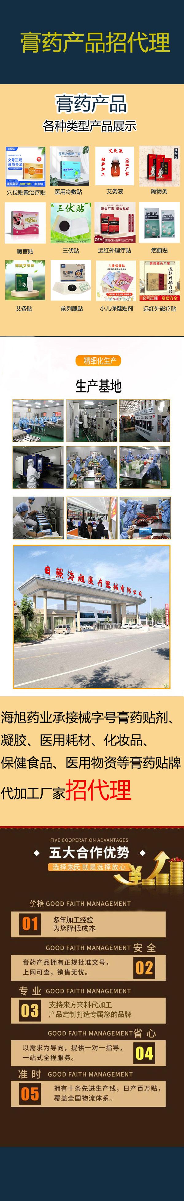 | 補(bǔ)充說(shuō)明 | 主要承接各類暖宮貼定制、遠(yuǎn)紅外理療貼代加工、磁療貼貼牌加工、穴位敷貼廠家、灸熱貼代加工、退熱貼代加工、燙熨治療包定制、小兒咳 喘腹瀉膏藥定制加工、艾灸貼定制、化妝品定制、保健食品定制、噴劑、乳膏類加 工等醫(yī)院臨床和終端診所所需的系列產(chǎn)品。公司的經(jīng)營(yíng)范圍有:骨科,婦科、男科、手術(shù)科、五官科和小兒科等 |