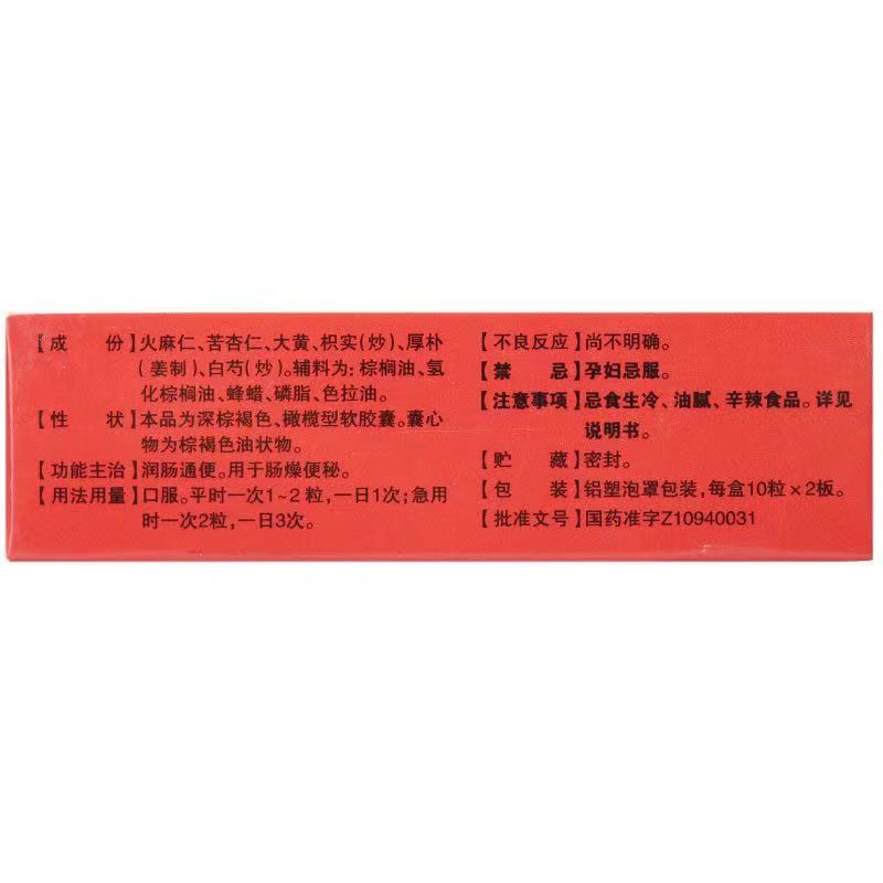 | 主要成分 | 火麻仁、苦杏仁、大黃、枳實(shí)(炒)、厚樸(姜制)、白芍(炒)。輔料為棕櫚油、氫化棕櫚油、蜂蠟、磷脂、色拉油。 |