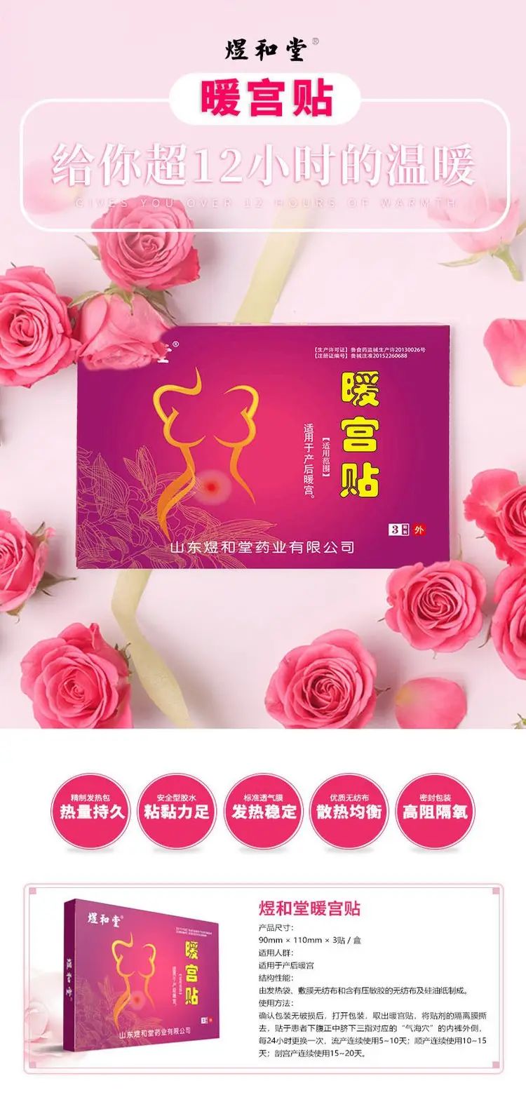 | 使用方法 | 確認(rèn)包裝無破損后,打開包裝,取出暖宮貼,將貼劑的隔離膜撕去,貼于患者下腹正中臍下三指對應(yīng)的“氣海穴”的內(nèi)褲外側(cè),每24小時更換一次,流產(chǎn)連續(xù)使用5~10天;順產(chǎn)連續(xù)使用10~15天;剖宮產(chǎn)連續(xù)使用15~20天 |