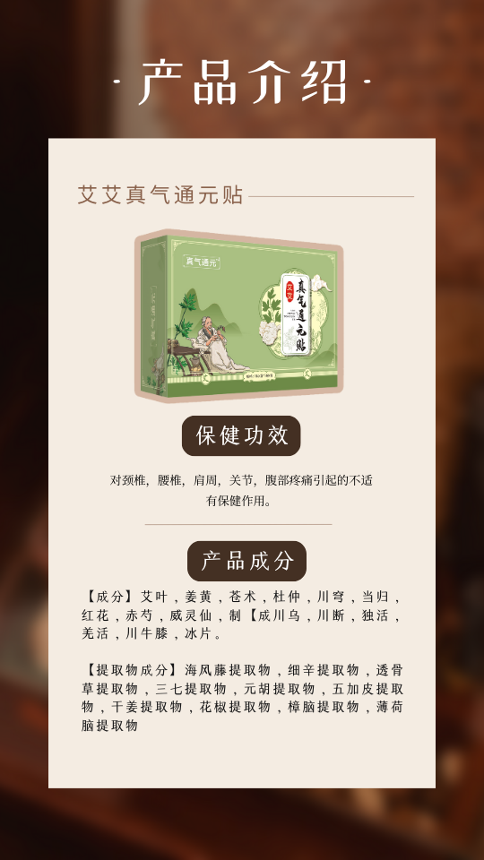 | 主要成分 | 艾葉、姜黃、倉術(shù)、干姜、杜仲、川穹、當(dāng)歸、紅花、透骨草等 |