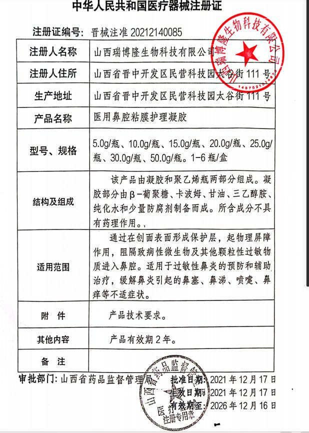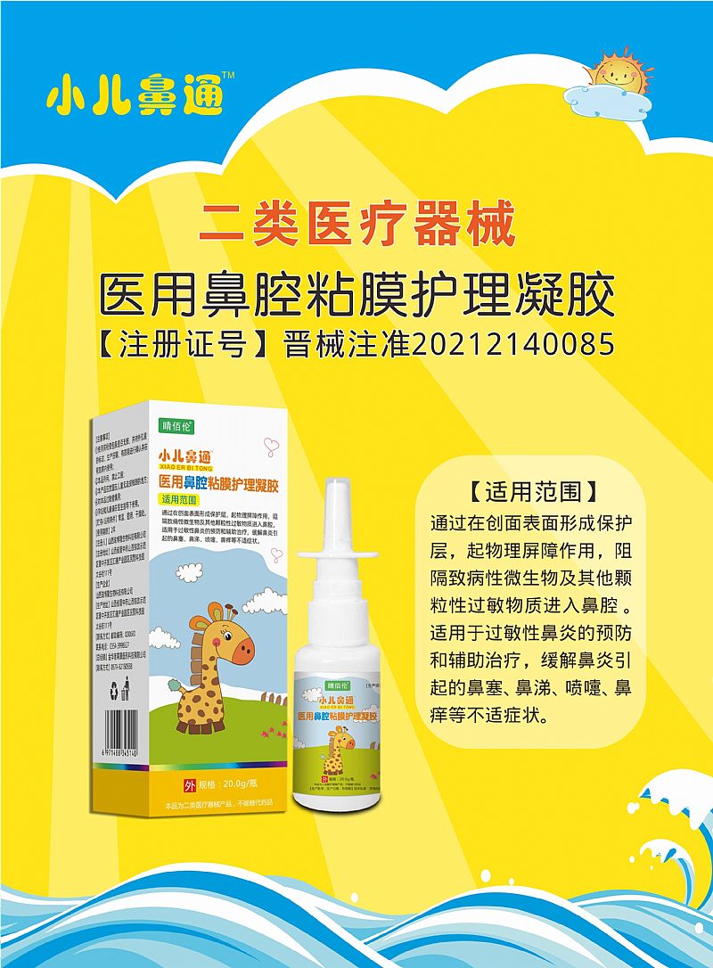 | 補(bǔ)充說(shuō)明 | 通過(guò)在創(chuàng)面表面形成保護(hù)層,起物理屏障作用,阻隔致病性微生物及其他顆粒性過(guò)敏物質(zhì)進(jìn)入鼻腔。適用于過(guò)敏性鼻炎的預(yù)防和輔助治療,緩解鼻炎引起的鼻塞、鼻涕、噴嚏、鼻癢等不適癥狀。 |