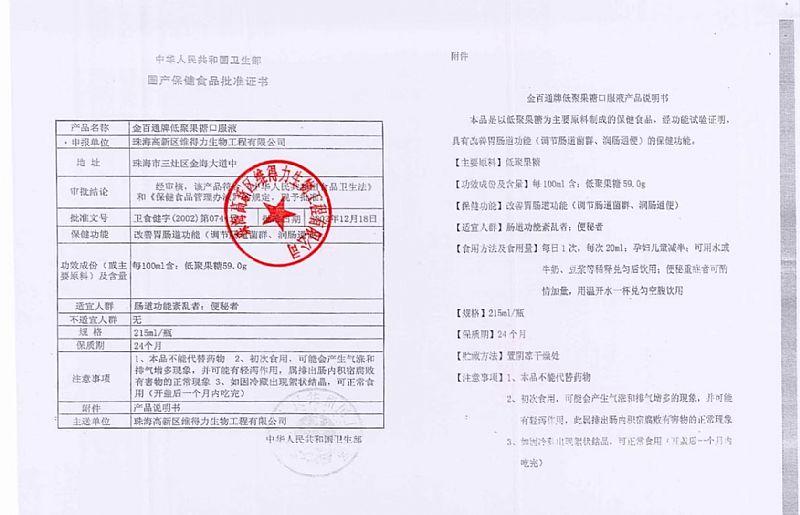 | 產(chǎn)品名稱 | 金百通牌低聚果糖口服液 |