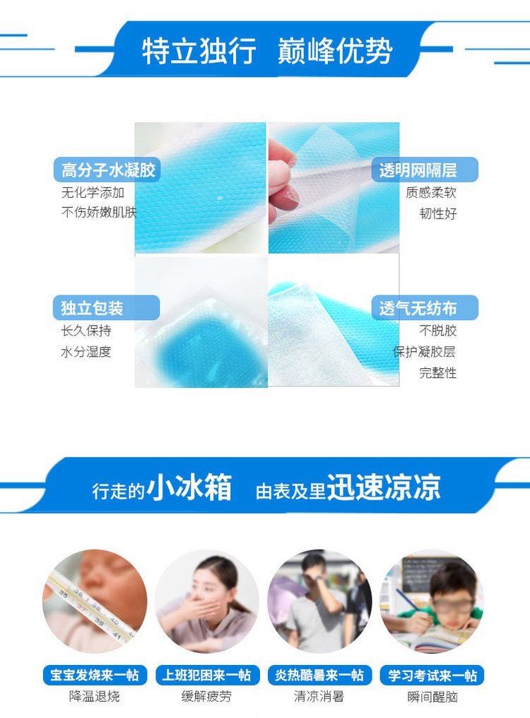 | 主要成分 | 本品由無(wú)紡布背襯層、凝膠層、聚乙烯薄膜覆蓋層組成。凝膠層由聚丙烯酸鈉、聚乙烯吡咯烷酮(液體)、甘羥鋁、甘油、食品添加著色劑(藍(lán)色)、純化水組成。降溫物質(zhì)不含有發(fā)揮藥理學(xué)、免疫學(xué)或者代謝作用的成分。非無(wú)菌產(chǎn)品。 |